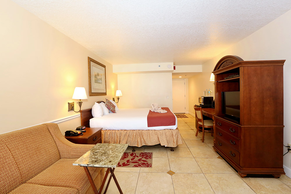 Our Garden View King Room is a large room on the ground floor with one king bed and twin sofa sleeper. Amenities include a cozy electric fireplace, private patio, 32-inch flat screen TV, microwave, refrigerator, coffee maker, electronic safe, and full private bathroom with tub/shower combination.
